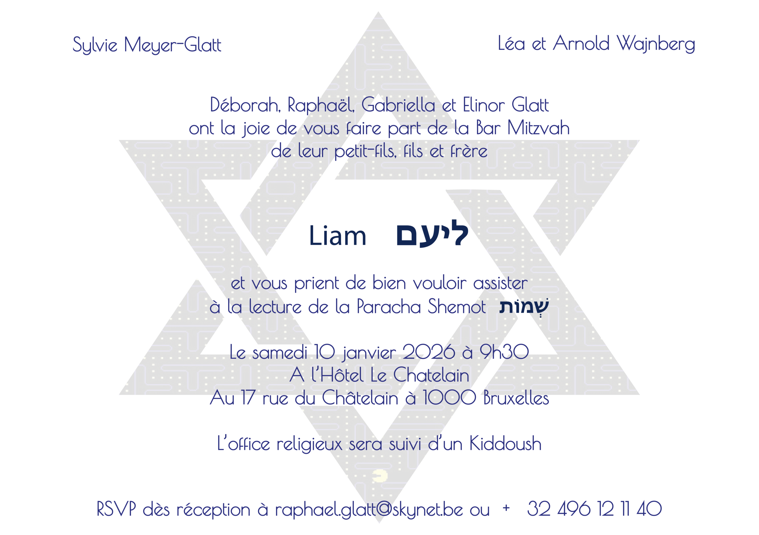 NB : nous vous serions très reconnaissants de bien vouloir respecter le Shabbat en éteignant vos téléphones portables pendant l’événement. Même si la célébration a lieu à l’hôtel et non dans une synagogue, votre attention à cette tradition contribuera à préserver le caractère spirituel et solennel de ce moment.